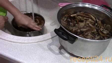 Промываем перебранные грибы под проточной водой, складываем в большую емкость подходящих размеров, заливаем водой и ставим на огонь.