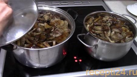 Грибы доводим до кипения и варим 5 минут на умеренном огне.