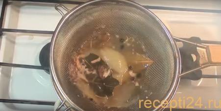 На протяжении всего времени продолжаем убирать ложкой жир с жидкости. Через два часа необходимо добавить в емкость 5 горошин душистого перца, 8 штук – черного, 4 лавровых листика, 1 зубчик чеснока. Оставляем все вариться еще на 1 час.