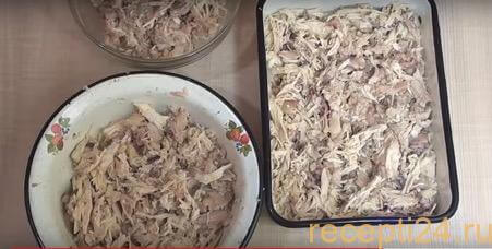 Остывшее мясо необходимо отделить от костей и разобрать на волокна, разложив по формам или по тарелкам. В каждой емкости должно быть количество мяса, занимающее чуть больше половины объема, которое заливаем бульоном до края тарелки и отправляем в холодное место.