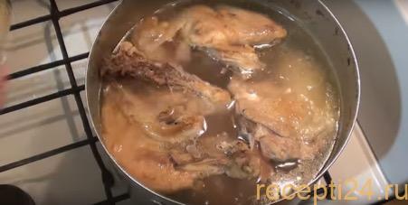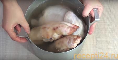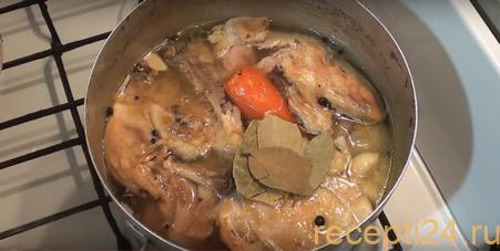 Куриную тушку разделяем на несколько больших частей и одновременно со свининой складываем в большую кастрюлю. Все это необходимо залить чистой водой, так, чтобы ее уровень был на 4 сантиметра выше мяса.