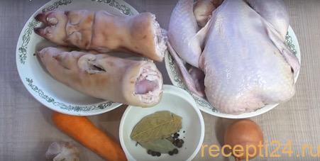 Чтобы получить прозрачный и чистый результат, необходимо замочить мясо на несколько часов (в идеале – на ночь). После этого свиные ноги лучше поскрести, курицу просто хорошенько промыть.