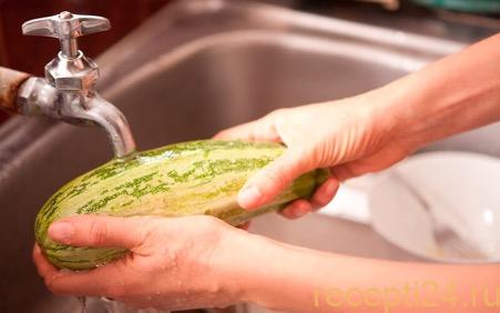 В это время тщательно моем молодой кабачок под проточной водой. Отрезаем от него черенок и кончик.
