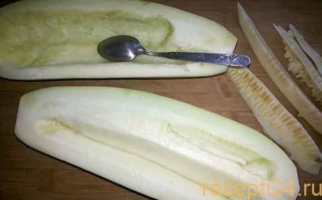 Вынимаем семена изнутри, очищаем кабачок от кожицы.