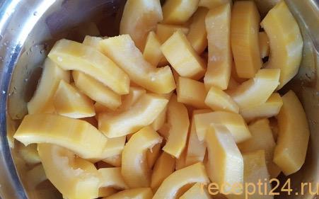 - Отбираем молодые плоды без изъянов и повреждений. Овощи необходимо помыть, очистить, вынуть семена и порезать кубиками 2 см.