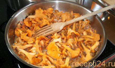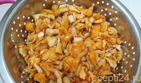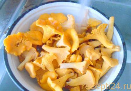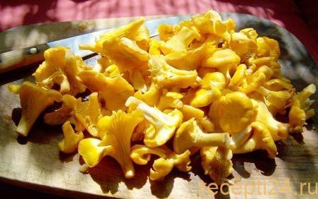 Грибы (1 кг) нужно тщательно перебрать, отрезать все лишнее, выбросить соринки, листики, грязь. Если попадаются слишком большие лисички, можно разрезать их на части.