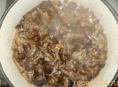 В кастрюлю с водой высыпаем промытые опята, ждем, когда они снова закипят. После этого уменьшаем уровень конфорки и варим все еще 30 минут.