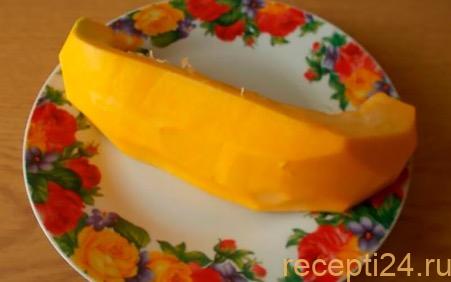 Срезаем с тыквы кожуру, избавляемся от внутренних волокон. Если кожура не очень твердая, можно использовать овощечистку.