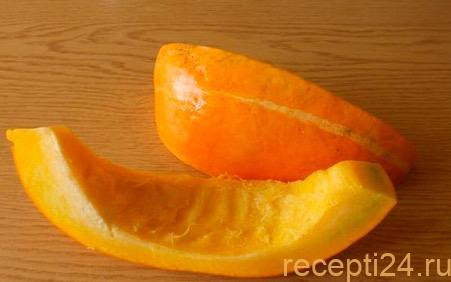 Сначала необходимо хорошенько промыть целую тыкву, разрезать ее на две половины и убрать семечки. Далее отрезаем от общей массы кусок весом 500 г.