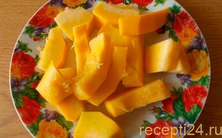 Подготовленные 500 г тыквы необходимо разрезать на кусочки, каждый не больше 5 см в толщину.