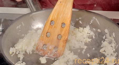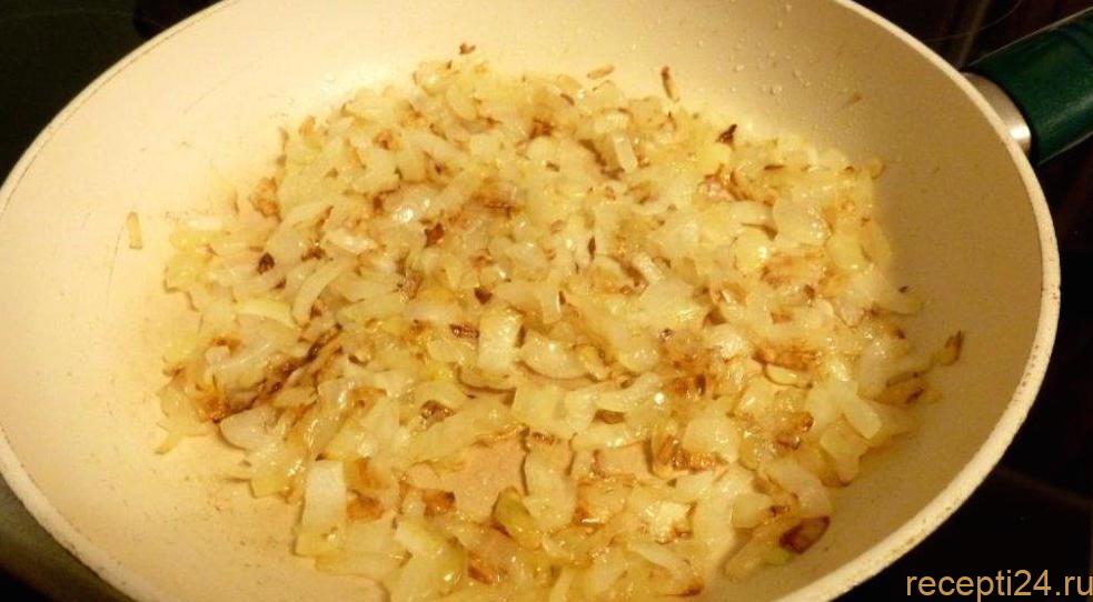 Пока тесто “отдыхает» займемся начинкой. Очистим от кожуры две больших луковицы, затем нарежем их мелкими кубиками. В разогретом на сковородке растительном масле поджарим их до появления золотистого цвета. Это займет у нас минут десять. Используем небольшой огонь. Не забываем помешивать, чтобы лук не подгорел.