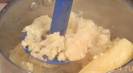 Сливаем воду, солим и перчим. Делаем пюре, используя мялку. Добавляем часть жареного лука.