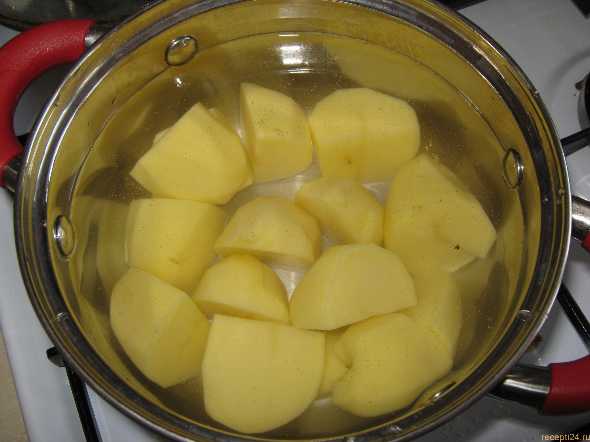 Моем, чистим и крупно нарезаем картофель. Отвариваем его до готовности: для этого доводим до кипения, затем варим 15 минут.