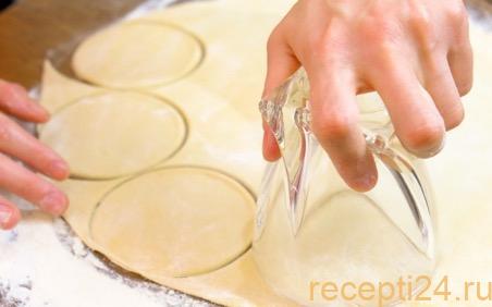 Теперь вернемся к тесту. Распределим его на части и будем тонко раскатывать, чтобы слой был не толще 2 мм. Затем вырезаем круги, используя форму диаметром около 7 см. Выкладываем на каждый кружок по одной чайной ложке начинки.