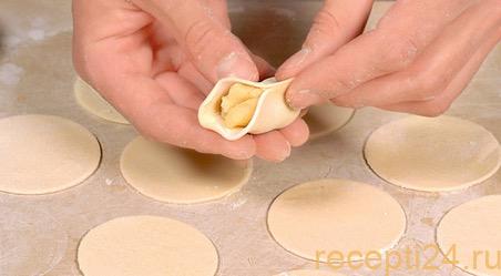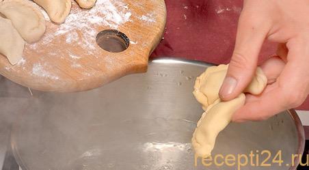 Складываем каждый круг вдвое, по периметру тщательно и аккуратно защипывая тесто. Если оно подсохло, края для большей эластичности можно слегка смочить водой.