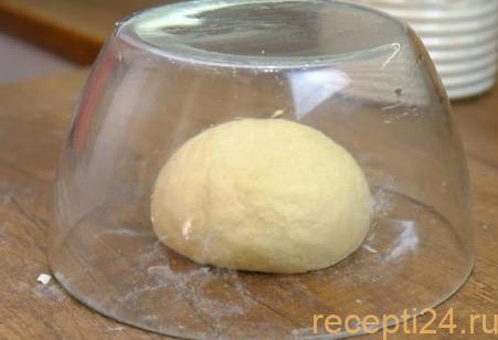 Оставляем тесто отдохнуть на столе, накрыв его миской. Можно оставить в глубокой миске, которую закрываем салфеткой или пищевой пленкой, чтобы тесто не заветривалось.