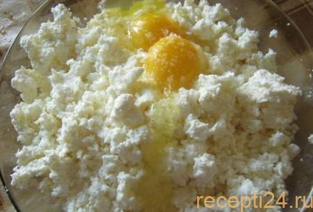 В это время готовим начинку. Смешиваем 400 г творога с 2 куриными желтками, добавляем 1 столовую ложку сахара (можно с горкой) и 1 чайную ложку ванильного сахара.