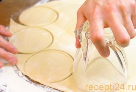 Подготовленное тесто раскатываем в тонкий пласт, 3-5 мм толщиной. С помощью стакана или чашки вырезаем в нем круги диаметром 6 -10 см. Чем больше диаметр, тем крупнее получатся вареники.
