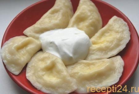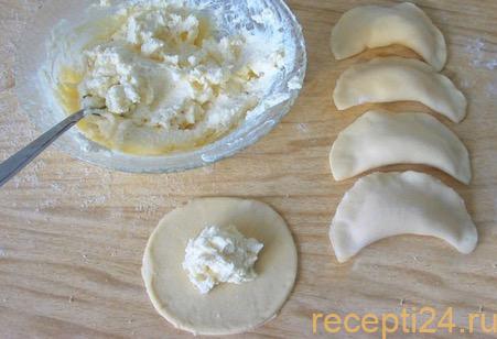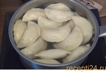 На каждый кружок выкладываем 1 столовую ложку начинки (с горкой или без – зависит от размера заготовки). Плотно соединяем края изделия. В это время нужно налить 2 л воды в кастрюлю, посолить и поставить на плиту для закипания.