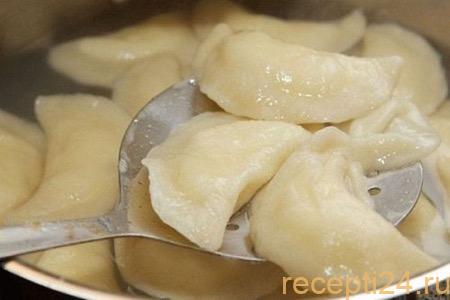 Опускаем сформированные вареники в кипящую воду, аккуратно помешивая, чтобы они не слиплись и не пристали ко дну. Ждем, пока изделия всплывут в кипятке, варим после этого еще 3 минуты.