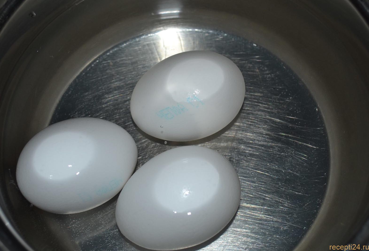 Положите яйца в посуду и налейте требуемое количество холодной воды — жидкость должна покрывать ингредиенты. Яйца положите в один ряд на дно ёмкости.