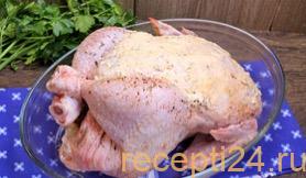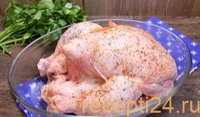 Тщательно промойте куриную тушку под струей холодной проточной воды. Обсушите птичку при помощи одноразовых полотенец или салфеток. После этих манипуляций, натрите главный ингредиент специями со всех сторон, используя соль, черный молотый перец и молотую паприку.