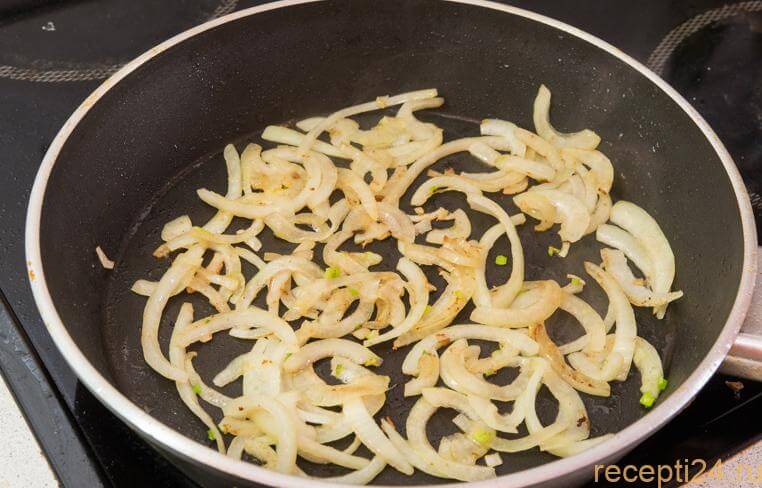 Завершив готовку печени, на ту же сковородку, выкладывайте предварительно нарезанный лук. Обжарьте его на среднем уровне нагрева до прозрачного состояния.