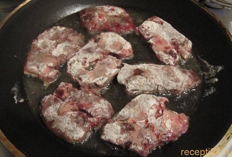 Раскалите сковородку и вылейте на нее 100 г растительного масла. Как только масло нагреется, укладывайте кусочки печенки, обжаривая их по 3-4 минуты с каждой стороны.