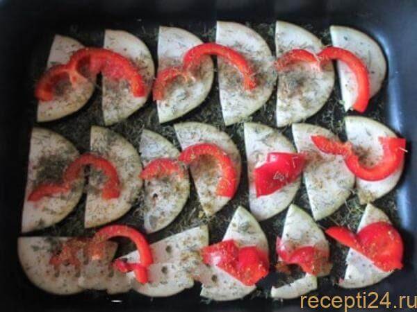 Нарезаем лук, обжариваем в 20 г маргарина или 1 ст. л. масла. Овощ должен стать золотистого цвета. Форму для выпекания смазываем маслом либо маргарином. Часть баклажана нарезаем полукольцами, складываем в емкость. Оставшийся овощ нарезаем мельче. Один болгарский перец нарезаем кусочками, раскладываем поверх полуколец баклажана, насыпаем мелко порезанную свежую либо сушеную зелень.