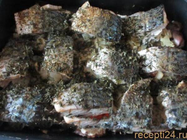 Теперь необходимо посыпать приправой, следующим слоем будет выложенная шкурой вверх рыба. Далее – вновь посыпаем «Хмели-сунели», зеленью.
