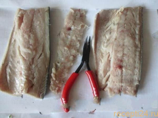 Каждую рыбку необходимо разрезать вдоль хребта, удалить его, выдернуть кости из тушки. Для удобства данной «операции» лучше воспользоваться небольшими плоскогубцами.