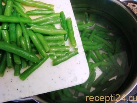 На первоначальном этапе приготовления блюда необходимо вскипятить 2 л воды, предварительно добавив в нее 0,5 ч.л. соли. Затем бросить в кастрюлю с кипятком промытые стручки фасоли и бланшировать на протяжении 2 минут. Следить, чтобы они оставались твердоватыми после проварки (важно помнить, что вскоре фасоль будет прожариваться на сковородке).