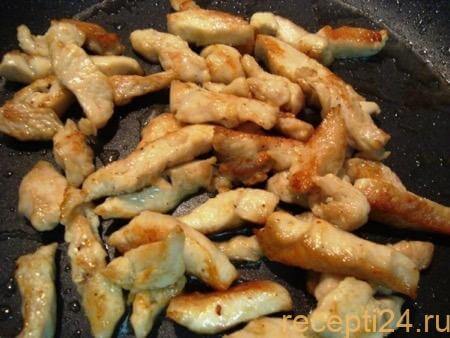 После того, как фасоль проварилась, нужно сцедить воду и приступить к обработке мяса: 300 г куриного филе промыть, подсушить на бумажном полотенце и нарезать полосками толщиной не более 1,5 сантиметров. Далее надо влить в сковородку 2 ст. л. оливкового масла, разогреть его в течение 30 секунд, затем обжарить мясо на протяжении 5 минут.