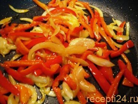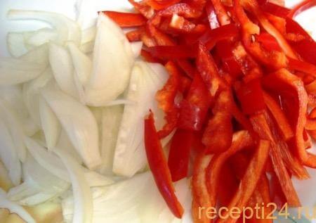 Пока куриное филе обжаривается, нужно переключиться на подготовку овощей: нарезать 1 луковицу и 1 болгарский перец полосками.