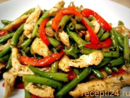 Измельченные овощи добавить в сковородку с зарумянившимся куриным филе, туда также всыпать отваренные стручки фасоли и продолжить прожарку блюда еще на 5 минут.