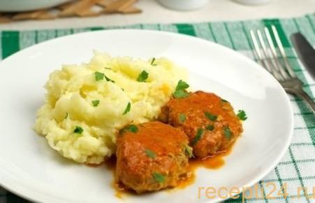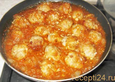 В глубокую сковороду выкладываем тефтели, заливаем их томатной подливой, сверху добавляем еще полстакана воды. Накрываем крышкой и готовим на минимальном огне 20 минут.