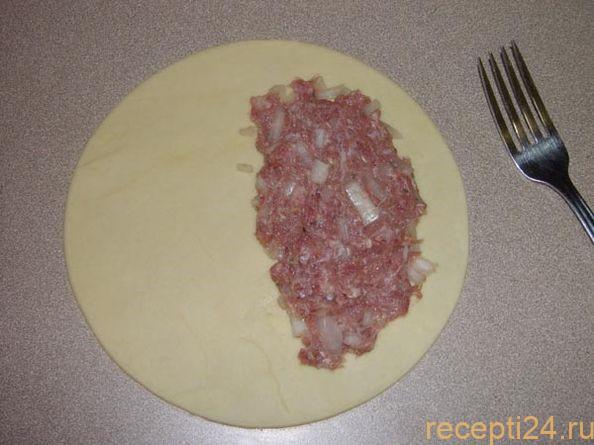 Такое тесто лучше всего начинять мясным фаршем. Хорошо в качестве начинки подойдет мясное ассорти (курица, говядина, свинина), с добавлением лука, черного молотого перца и разной зелени. В готовую начинку рекомендуется добавить небольшое количество холодной воды. Это добавит мясу сочности.