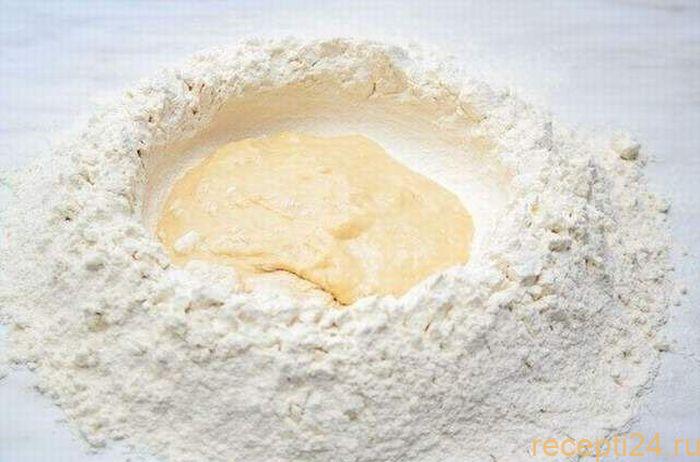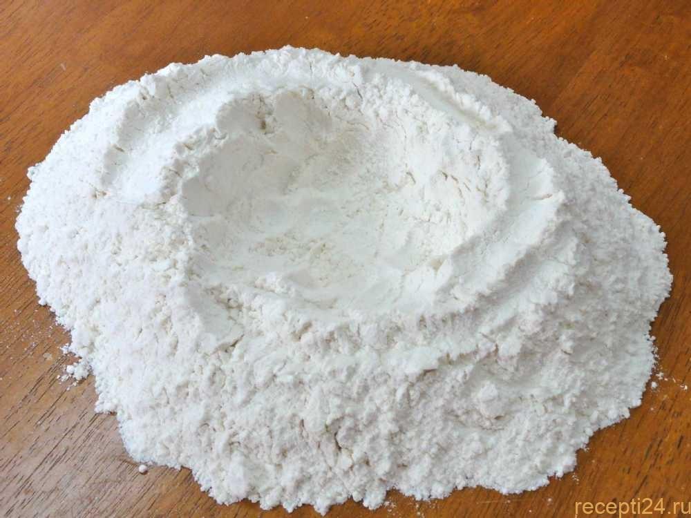 Муку нужно несколько раз просеять через сито. В результате таких действий, она насытится дополнительным воздухом, в результате чего, тесто будет больше пузыриться. Из муки нужно в миске или на разделочной доске сформировать горку.