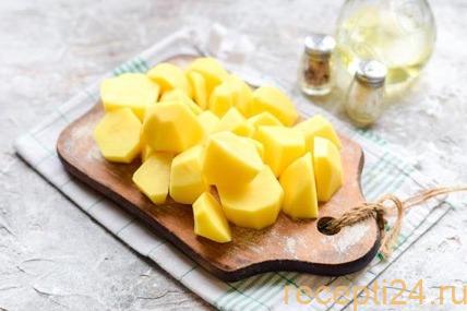 Сначала, стоит подготовить картофель. Его очищают кожуры, моют и нарезают кубиками. Не нужно шинковать сильно мелко.