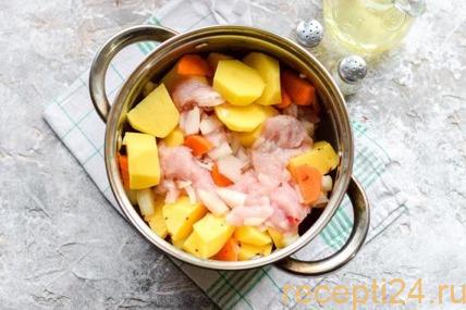 Все готовые элементы нужно переложить в заранее подготовленную посуду. Их надо посолить, добавить перец и приправы. Залить стаканом воды и поставить на небольшой огонь. Тушится картошка с курицей 40-45 минут.