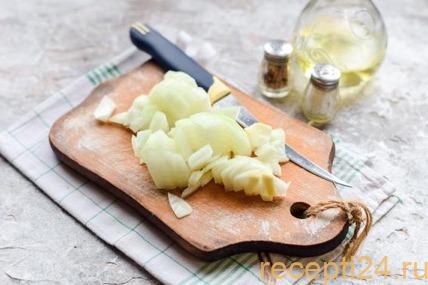 С лука снимают кожицу, нарезают полукольцами. Или же можно выбрать другой вариант нарезки.