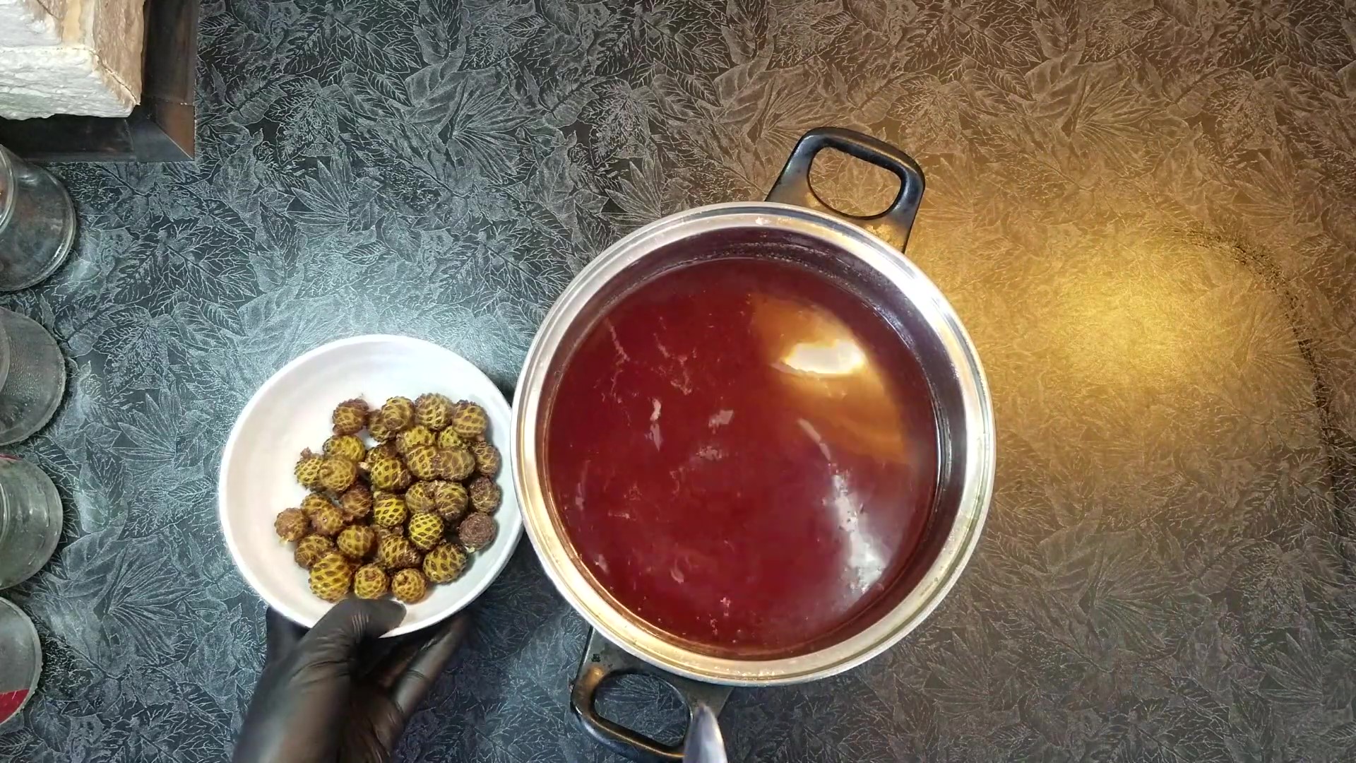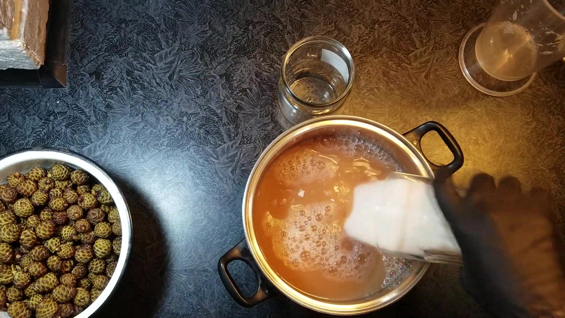 Следующим шагом нужно добавить часть шишек в кастрюлю с отваром и варить на медленном огне еще 20 минут