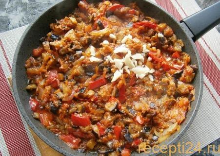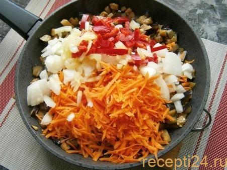 Затем к баклажанам добавляют лук, морковь и болгарский перец. Огонь нужно слегка уменьшить, что овощи равномерно готовились и не пригорели.