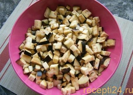 Сначала нужно нарезать баклажаны, посыпать солью и залить холодной водой. Овощи нужно оставить на 15 минут, чтоб ушла горечь.