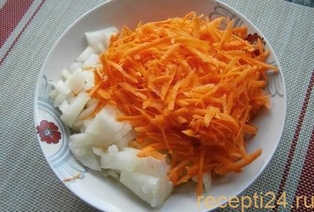 Морковь необходимо натереть на терке. Лук — порезать небольшими кубиками или полукольцами.