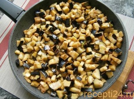 В большой сковороде надо разогреть растительное масло. Туда добавляют баклажаны и жарят на большом огне 6-8 минут.