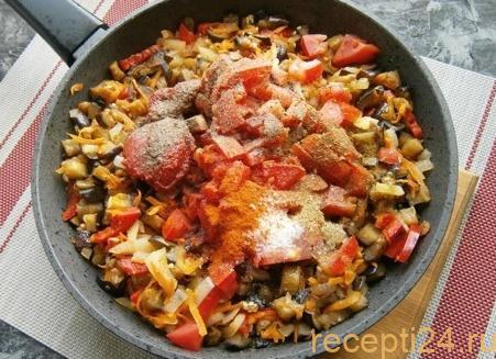 Через 5-6 минут в смесь нужно добавить мелко нарезанные помидоры, томатную пасту и специи.